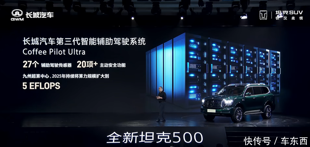 硬件方面,全新坦克500搭载了激光雷达,拥有27个辅助驾驶传感器。同时长城汽车方面表示,其九州超算中心,2025年算力规模将扩大到5EFLOPS。