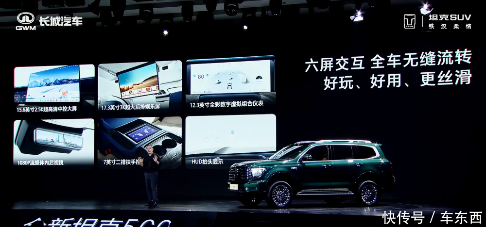 “彩电”上,全新坦克500支持六屏交互,前排座舱中采用了12.3英寸仪表屏幕+15.6英寸的中控大屏以及HUD抬头显示的组合。
